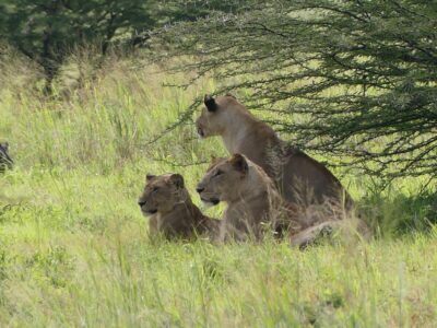 In de Serengeti waren we getuige van een geslaagde jacht van een cheetah op een jonge antilope, en ze deelde de buit met haar jongen. We troffen daar ook een groep van 17 relaxte leeuwen aan.
