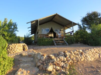Je overnacht in een van de fijne accommodaties in of rond Oudtshoorn. Mijn favoriet: AfriCamps, een stijlvolle glamping-plek met ruime safaritenten, een eigen keuken en badkamer, en een houtgestookte hottub op je veranda. In de avond kun je zelf braaien en geniet je onder de sterren van de stilte van de Karoo.